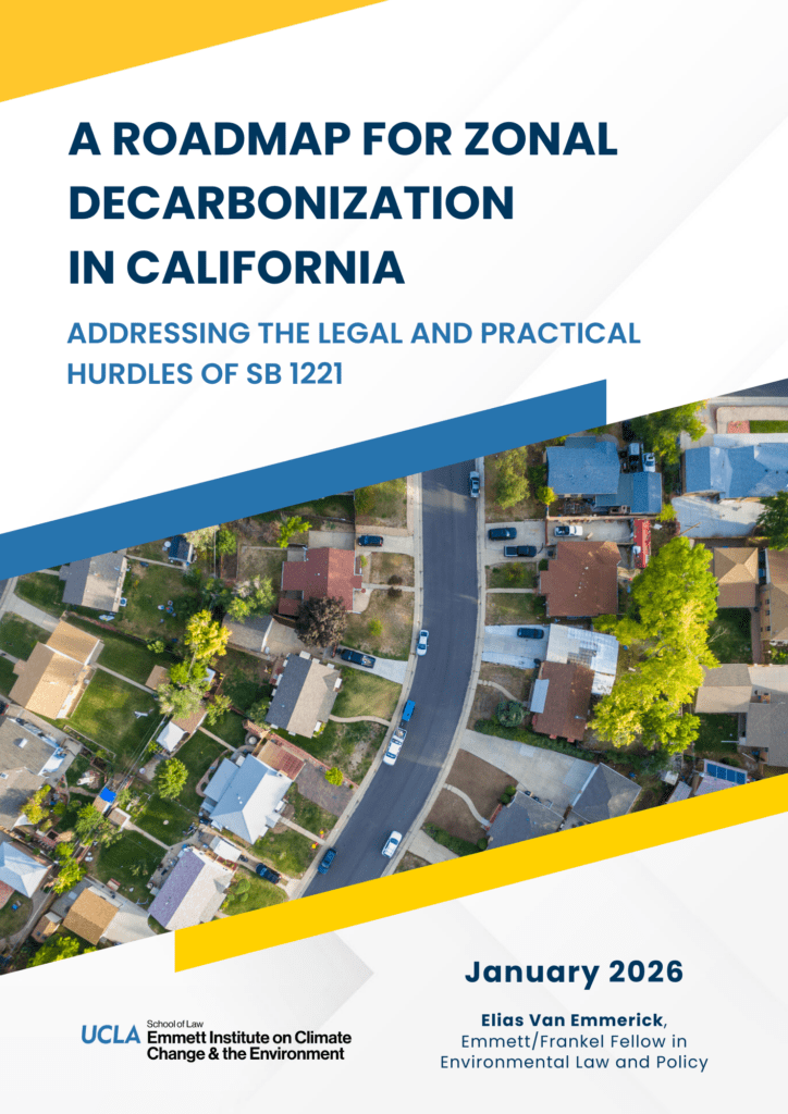In a new paper, I seek to address the legal and practical hurdles that SB 1221 will likely face. The brief, A Roadmap for Zonal Decarbonization in California, is the first in a series from the Emmett Institute on legal insights for the gas transition. In it, I discuss the promise of SB 1221, its potential pitfalls, and issue recommendations for utilities and policymakers to make the most of the lessons learned during this pilot program, as the utilities begin the crucial work of engaging with communities in these zones. The brief tackles questions around cost recovery, which have stalled prior decarbonization projects, the legal “obligation to serve,” and offers recommendations for the CPUC. It stresses the need for proactive, community-centered outreach to ensure participation, broad definitions of possible benefits in the cost-benefit analyses underlying electrification viability, and expansive reporting requirements to ensure that lessons learned from this program can assist larger-scale decarbonization efforts down the road. The brief recommends the CPUC: